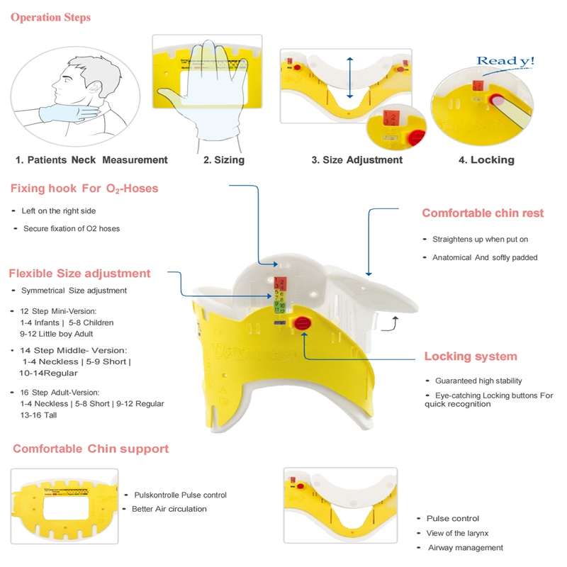 Bu kurtarma yakası, kurtarıcıların hasta nakli, rutin bakım ve müdahale sırasında nötr hizalamayı korumalarına ve servikal omurganın yanal (yana doğru) hareketinin yanı sıra ön-arka fleksiyon ve ekstansiyonunu önlemelerine yardımcı olmak için tasarlanmış tek parça, sert bir servikal omurga sabitleme cihazıdır.
